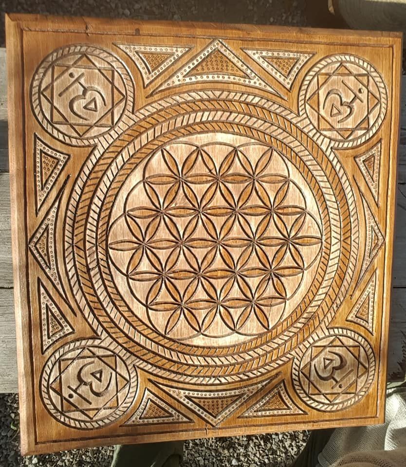 Les Créations Murales sont Réalisées en Pin, découpé à la scie sauteuse, raboté à la lime ou au rabot, gravé au Dremel, teinté à la brou de Noix, vernis à l' huile de Lin.